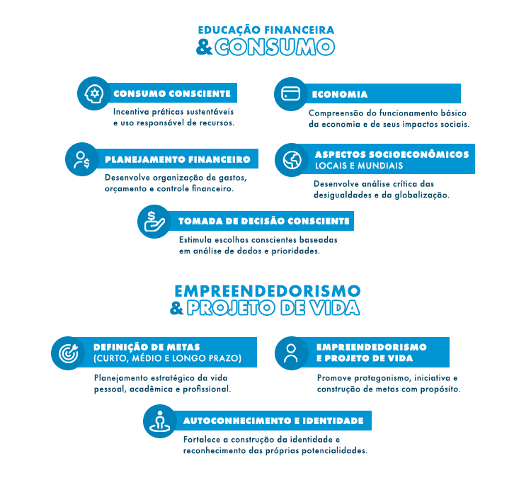 Conteúdo que vai além do cálculo e de ferramentas matemáticas. A proposta é desenvolver nos estudantes habilidades que lhes proporcionem a administração financeira de sua vida em sociedade, subsidiando – de forma prática e efetiva – a construção de seus projetos de vida.